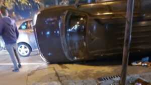 Si pasojë e përplasjes, njëra makinë është përmbysur në mes të rrugës, ndërsa automjeti tjetër ka goditur një dyqan kancelarie, duke shkaktuar dëme të konsiderueshme materiale.