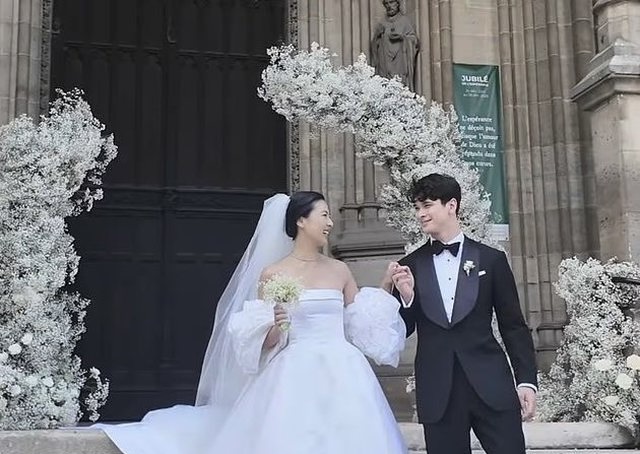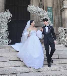 Ceremonia u mbajt në Bazilikën Sainte-Clotilde, ndërsa “Vogue” e cilësoi atë si një nga dasmat më elegante të vitit. Nusja u shfaq me një fustan të personalizuar nga dizajneri Andrew Kwon, të shoqëruar me vello katedrale dhe këpucë “Manolo Campari”.