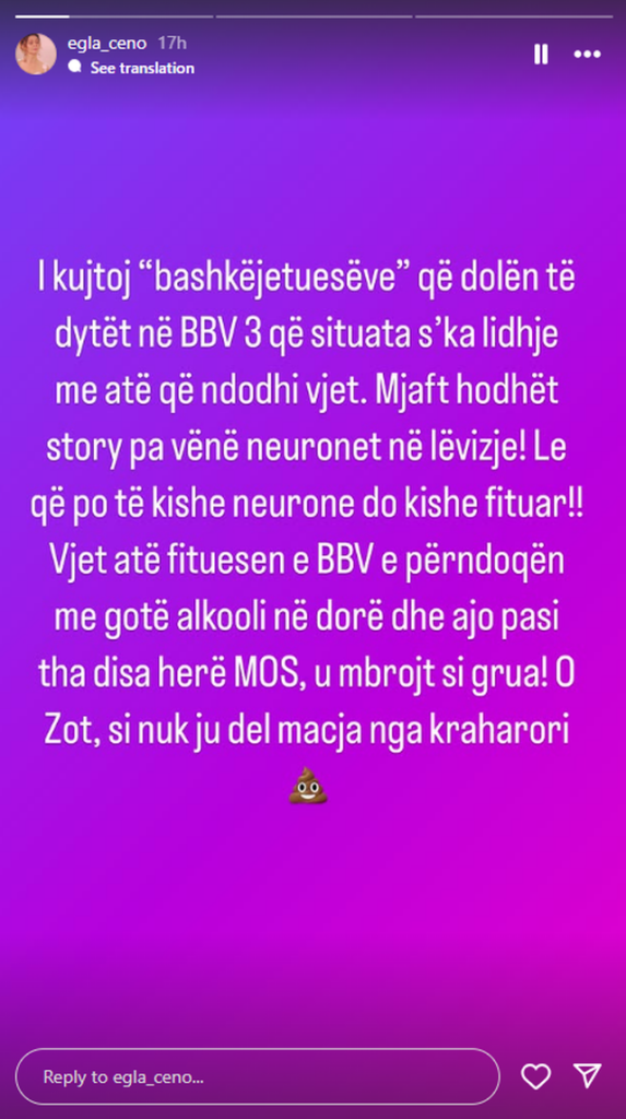 Fituesja e Big Brother VIP Albania 3, Egla Ceno, ka reaguar lidhur me ngjarjen e ndodhur mbrëmjen e së hënës në shtëpinë e Big Brother VIP Albania 4, ku Gerta Gixhari i hodhi alkool në sy banorit Gjesti, duke e detyruar të largohej për pak kohë për ndihmë mjekësore.