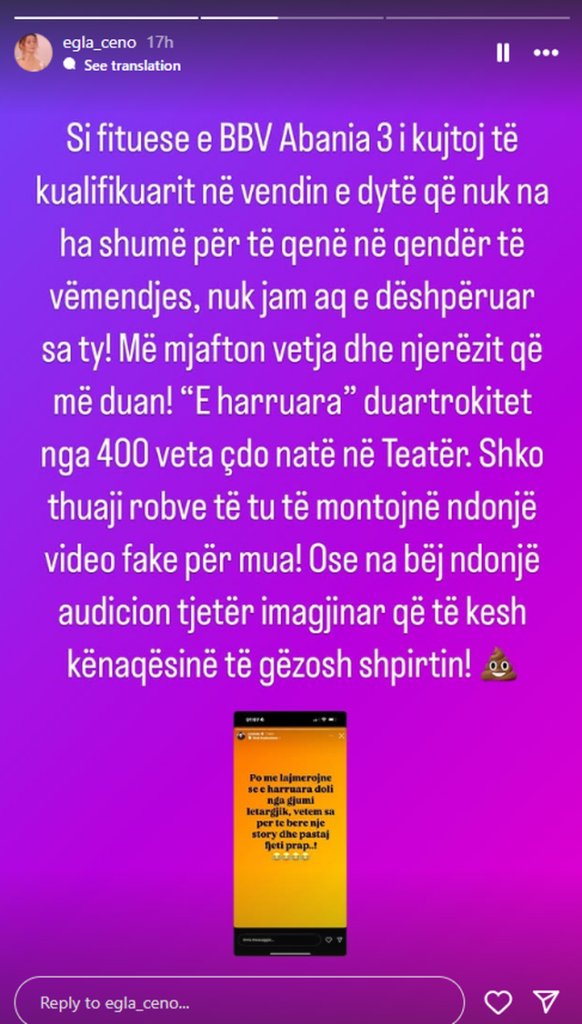 “Këtë vit nuk kishte lidhje me Gertën, u fut aty për të prishur dasmën, lagu Loredanën, ku hynte aty? Unë Gertën e kam pëlqyer herë pas here, por këtë herë gaboi. Duhet të dalë.” – përfundoi Egla.