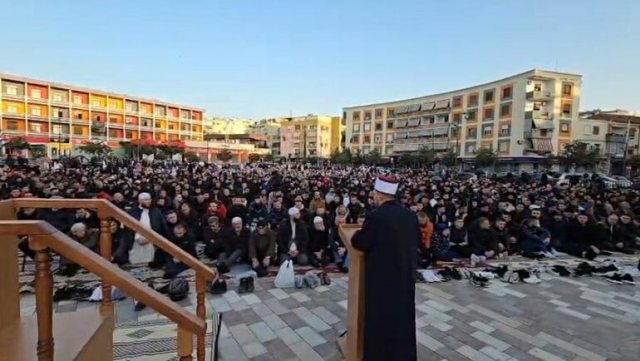 Në Vlorë, qindra qytetarë falën Bajramin në Pallatin e Sportit, ndërsa myftiu Ardit Hoxhllaku theksoi rëndësinë e përkushtimit ndaj familjes dhe ndihmës për njerëzit në nevojë.