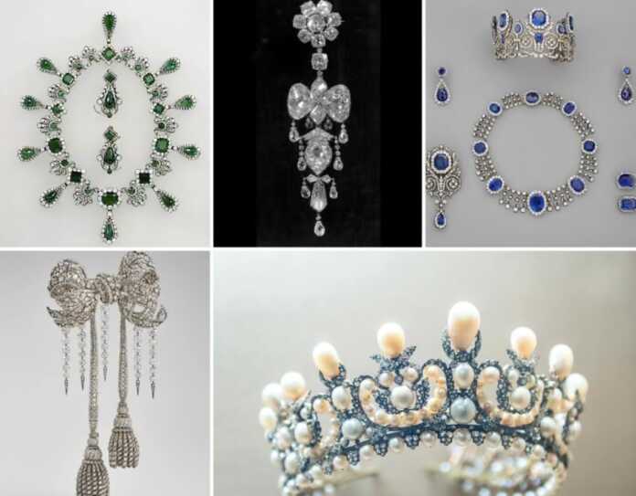 • Set bizhuterish me safir, duke përfshirë diademën me 24 safirë Cejloni dhe 1,083 diamante, gjerdanin me tetë safirë të rrethuar nga diamante dhe një palë vathë (vetëm një vathë u vodh).