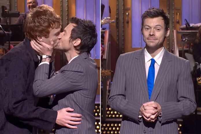 Momenti më i komentuar erdhi kur aktori i SNL, Ben Marshall, u shfaq në skenë. Styles e tërhoqi dhe e puthi, duke shtuar me ironi: