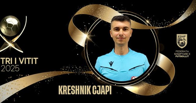 Në edicionin e këtij viti të mbrëmjes gala “Topi i Artë”, Kreshnik Cjapi u nderua me çmimin prestigjioz “Arbitri i Vitit 2025”, duke u vlerësuar për profesionalizmin, vendimet e sigurta dhe kontributin e tij gjatë gjithë sezonit në ndeshjet kombëtare dhe ndërkombëtare.