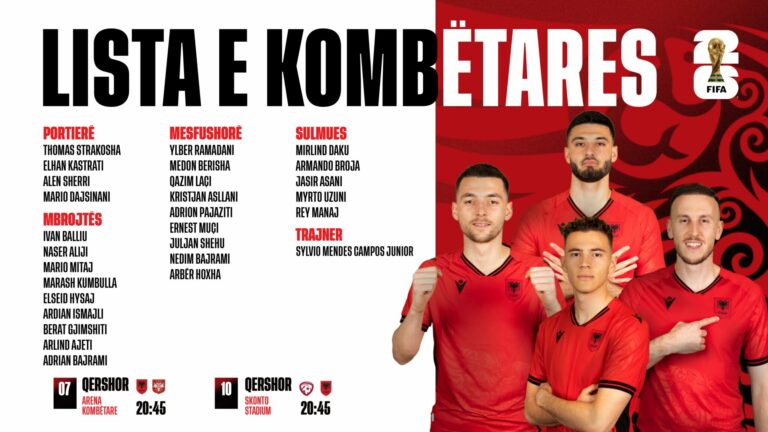 Trajneri i Kombëtares kuqezi, Silvinjo, ka bërë publike listën zyrtare të futbollistëve të grumbulluar për dy sfidat miqësore të muajit qershor. Shqipëria do të përballet më 7 qershor me Serbinë dhe më 9 qershor me Letoninë, si pjesë e përgatitjeve për Euro 2024.