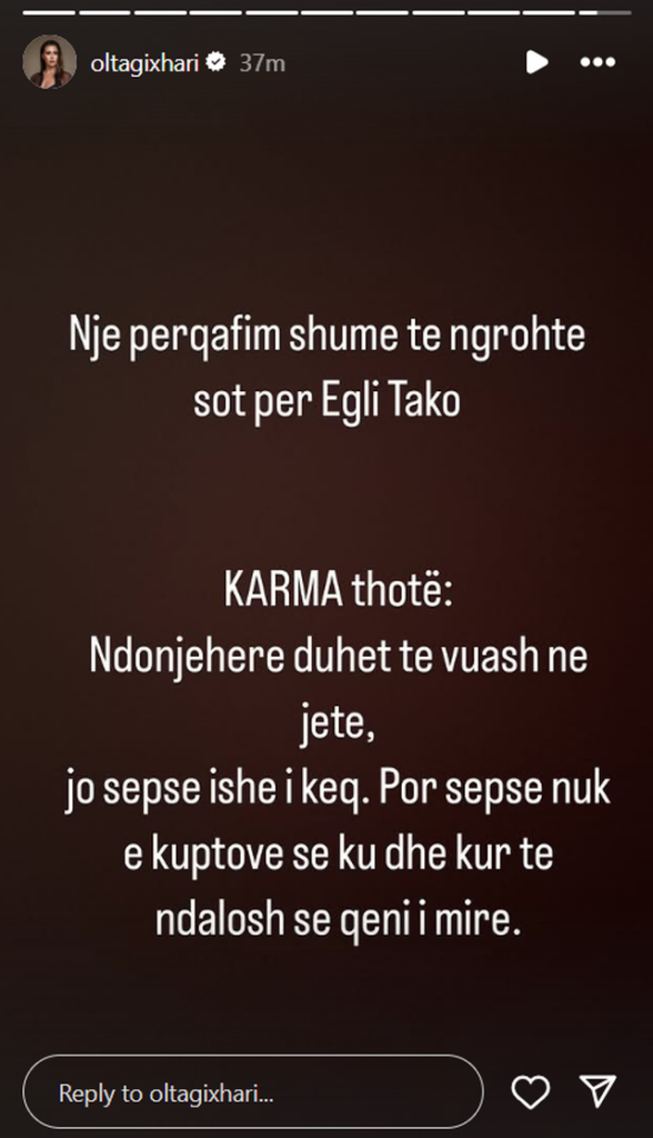 “Një përqafim shumë të ngrohtë sot për Egli Tako. KARMA thotë: Ndonjëherë duhet të vuash në jetë, jo sepse ishe i keq. Por sepse nuk e kuptove se ku dhe kur të ndalosh së qeni i mirë.”, ka shkruar Gixhari.