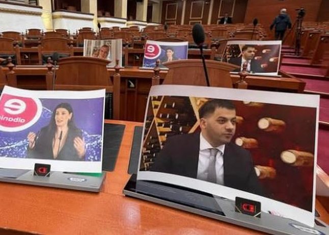 Në tavolinat e deputetëve janë vendosur foto të Mirlinda Karçanaj, Ergys Agasi dhe Ermal Beqiri, të përmendur në hetimet për korrupsion dhe abuzime me tenderat publikë.