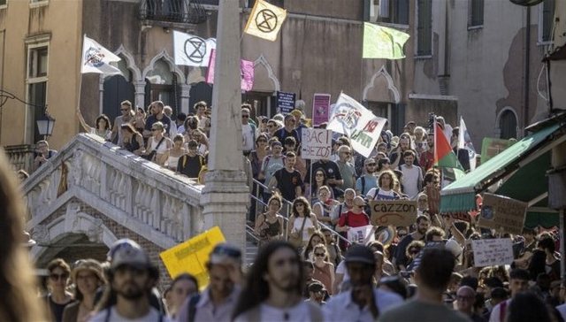 Marshimi nisi nga Sheshi i Stacionit dhe përfundoi në urën ikonike Rialto, ndërsa protestuesit mbanin pankarta ku shkruhej: “Venecia nuk është për shitje”, “Jo shfrytëzimit korporativ”, “Liri për Palestinën”. Atmosfera ishte e tensionuar, por paqësore.