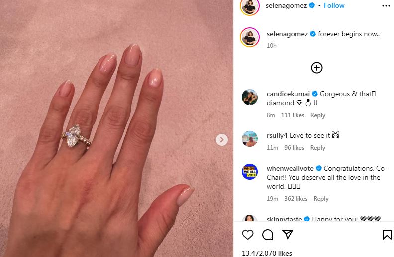 Lajmi për fejesën u bë i njohur nga vetë këngëtarja, e cila shpërndau disa foto ku tregohej unaza e fejesës që Benny i kishte dhuruar, duke e bërë këtë moment edhe më të veçantë. Selena Gomez dukej shumë e lumtur dhe e emocionuar, e duke mbajtur në gisht unazën që tregon për angazhimin e tyre të përjetshëm.
