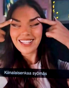 Ngjarja ndodhi më 1 dhjetor, pasi media finlandeze Ilta-Sanomat publikoi një imazh të Sarah-s që po qarkullonte me shpejtësi në Snapchat dhe Instagram. Në foto, ajo shihej duke tërhequr sytë me gishta për t’u dukur “të pjerrët”, një gjest i njohur ndërkombëtarisht si tallës ndaj komuniteteve aziatike. Mbishkrimi në finlandisht “Kiinalaisenkaa syömäs” (“Duke ngrënë me një kinez/ushqim kinez”) u konsiderua përmbajtje raciste dhe shkaktoi një reagim të fortë publik.