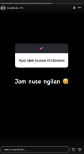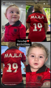 Mbrëmjen e sotme, modelja tregoi edhe mbështetjen për partnerin e saj gjatë ndeshjes së Kombëtares kundër Andorrës, duke publikuar një foto të një bebeje në “Instastory” dhe duke shkruar: “Forca Daja Mirlind”, duke shprehur dashurinë dhe inkurajimin për sulmuesin.